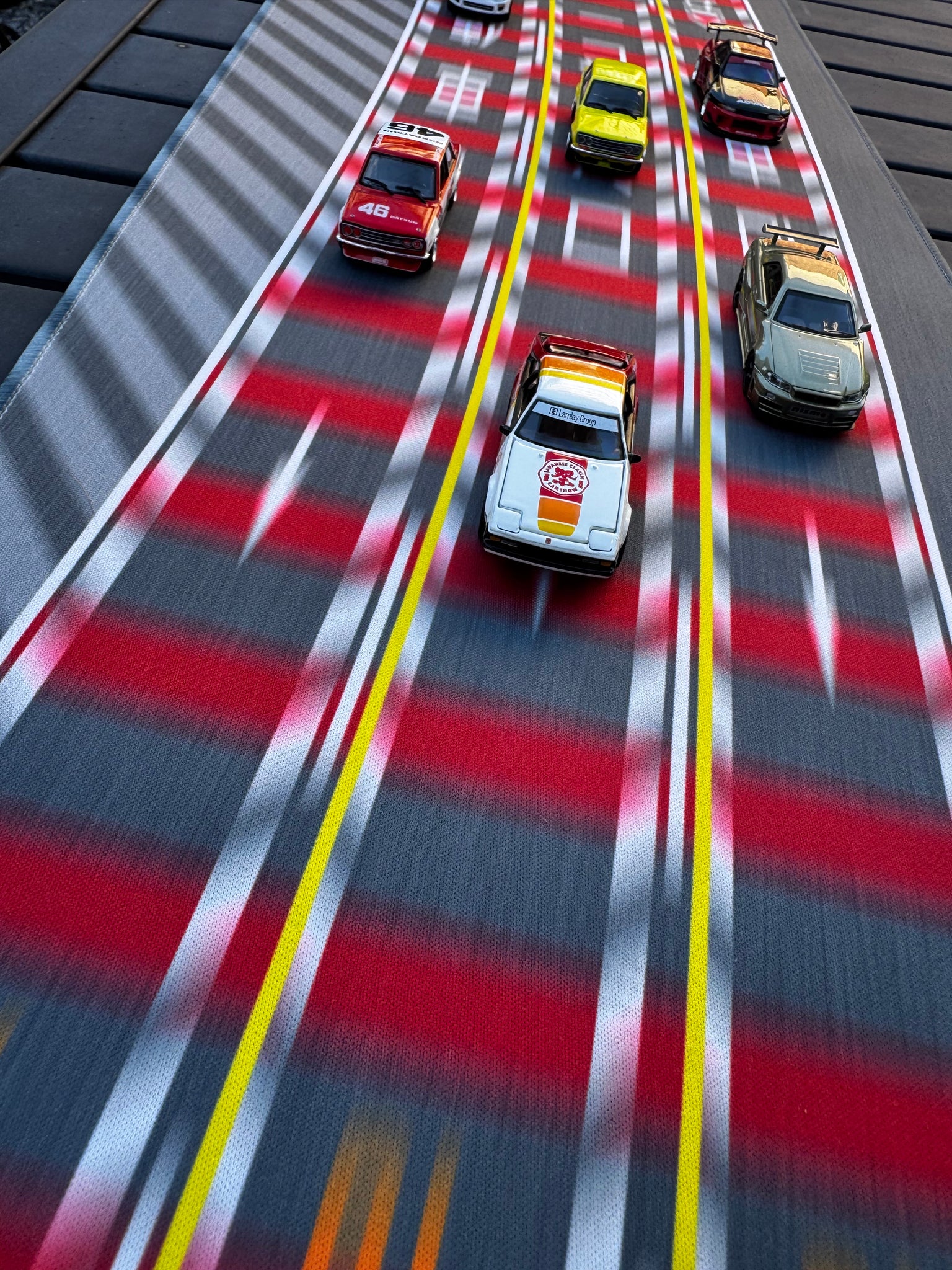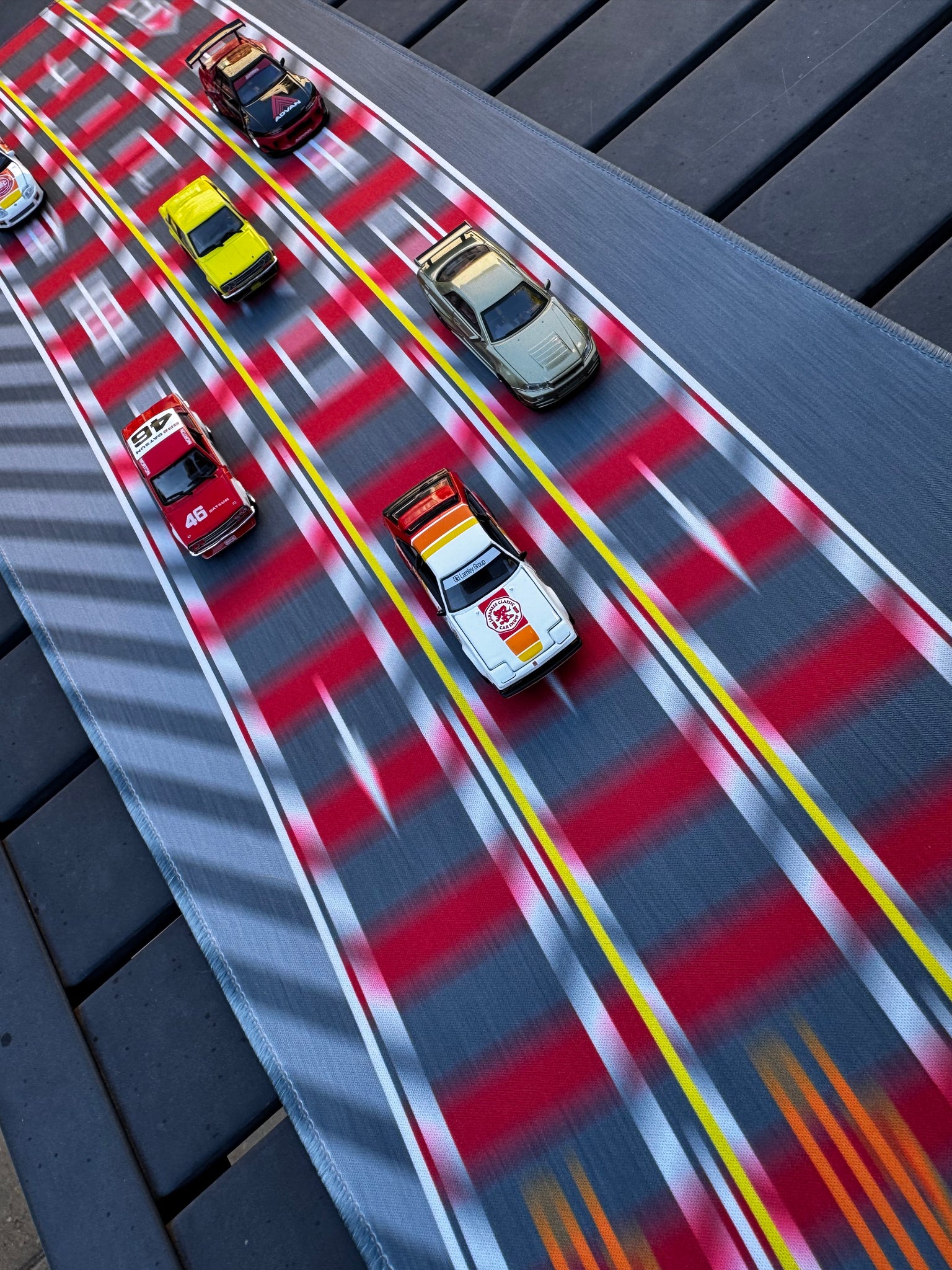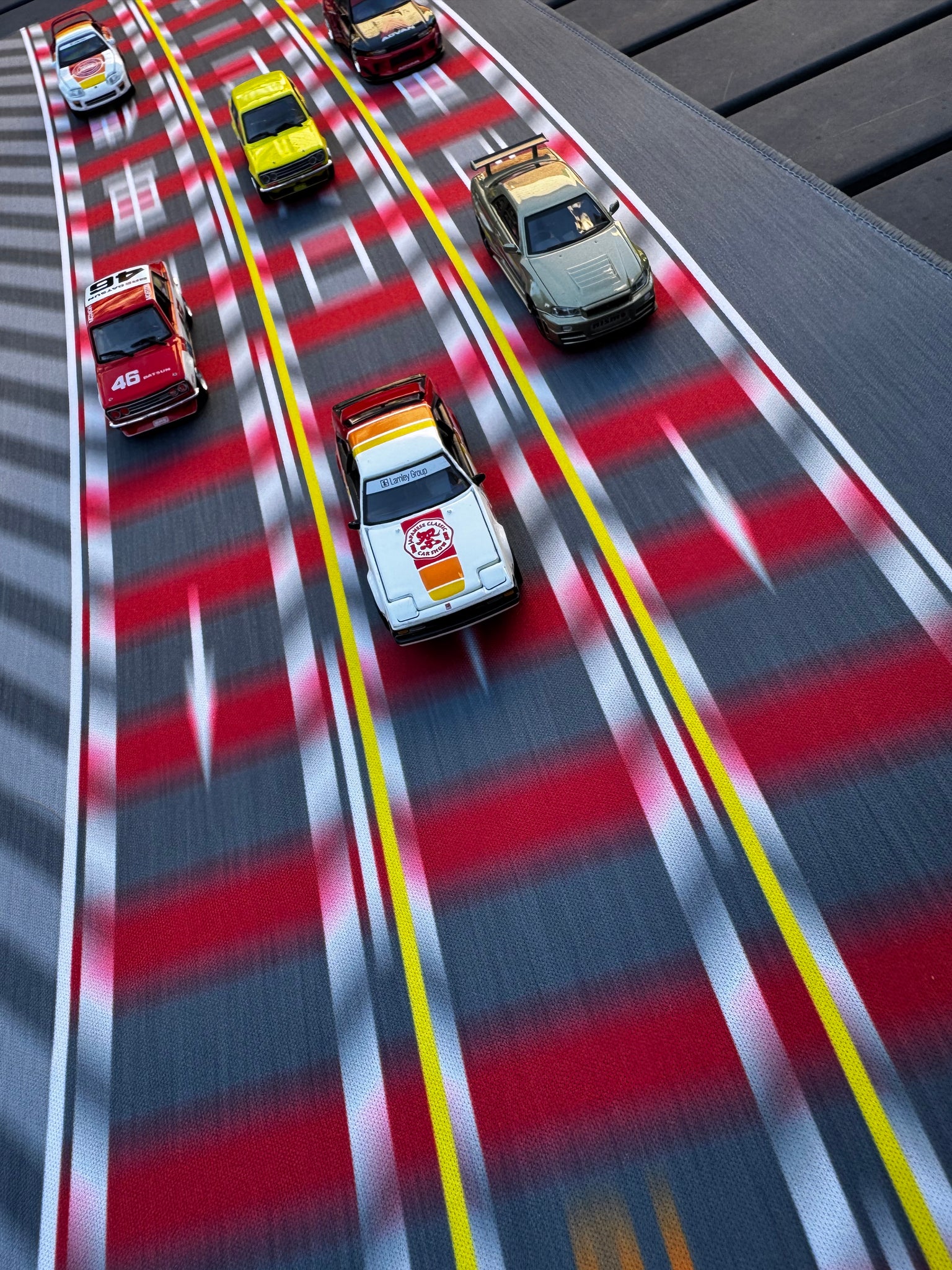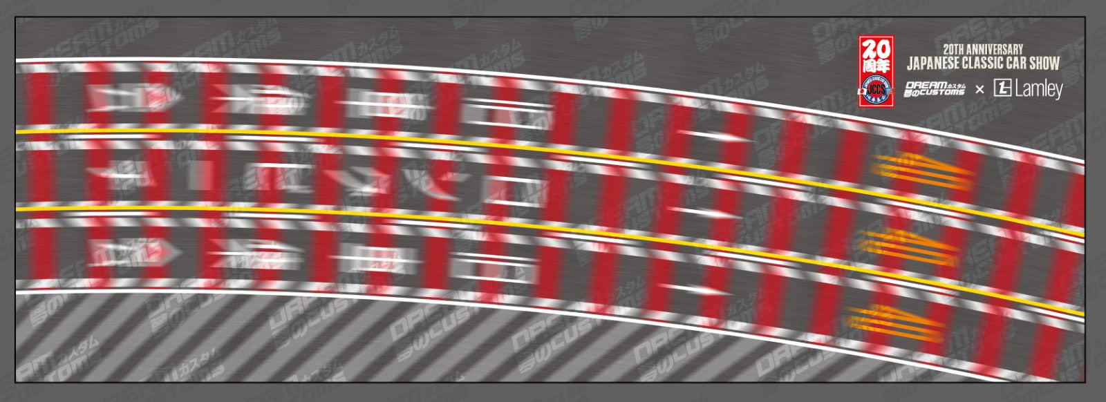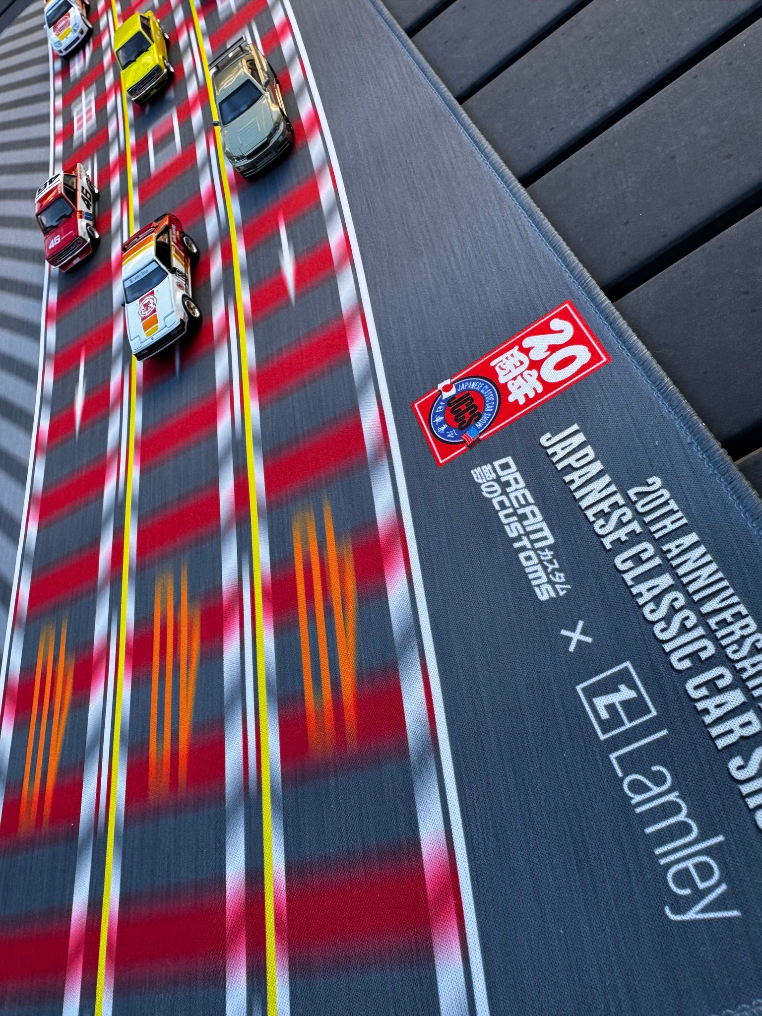 This diorama mat showcases three lanes, reflecting the real-life complexity of Wangan. Additionally, it proudly displays the 20th Anniversary logo for JCCS, along with the Lamley & Dream Customs logos. This mousepad not only serves a practical purpose but also acts as a striking piece of art for any workspace or gaming setup.