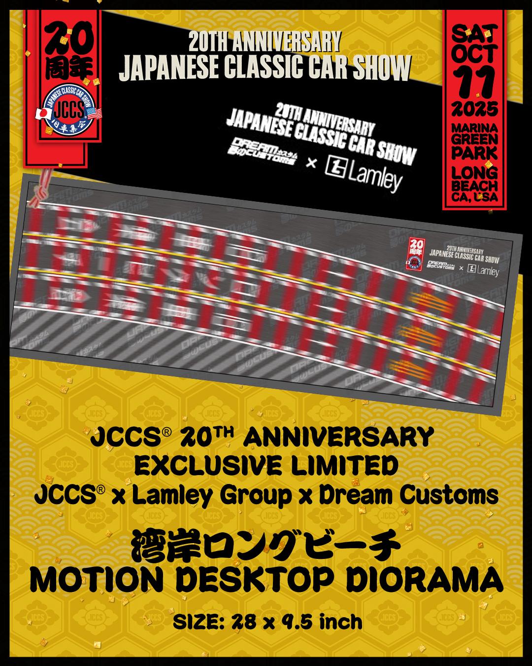 The Dream Customs x Lamley Group Motion Series presents the Wangan Long Beach Desktop Diorama, celebrating 20 years of the Japanese Classic Car Show.  This unique mousepad has been specially designed and sold at JCCS in early October, and a small amount have been reserved for this sale.